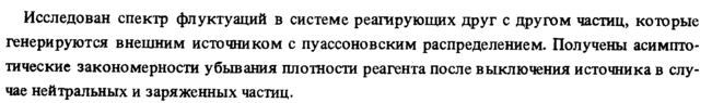 Исследован спектр флуктуаций в системе реагирующих друг с другом частиц, которые генерируются внешним источником с пуассоновским распределением. Получены асимптотические закономерности убывания плотности реагента после выключения источника в случае нейтральных и заряженных частиц.
