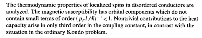 The thermodynamic properties of localized spins in disordered conductors are analyzed. The magnetic susceptibility has orbital components which do not contain small terms of order (pFl /Щ~х < 1. Nontrivial contributions to the heat capacity arise in only third order in the coupling constant, in contrast with the situation in the ordinary Kondo problem.