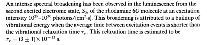 An intense spectral broadening has been observed in the luminescence from the second excited electronic state, S2, of the rhodamine 6G molecule at an excitation intensity ΙΟ29—1030 photons/(cm2-s). This broadening is attributed to a buildup of vibrational energy when the average time between excitation events is shorter than the vibrational relaxation time rr. This relaxation time is estimated to be rr=(3±l)XlO-13 s.
