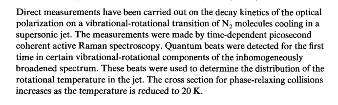 Direct measurements have been carried out on the decay kinetics of the optical polarization on a vibrational-rotational transition of N2 molecules cooling in a supersonic jet. The measurements were made by time-dependent picosecond coherent active Raman spectroscopy. Quantum beats were detected for the first time in certain vibrational-rotational components of the inhomogeneously broadened spectrum. These beats were used to determine the distribution of the rotational temperature in the jet. The cross section for phase-relaxing collisions increases as the temperature is reduced to 20 K.
