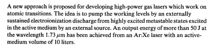 A new approach is proposed for developing high-power gas lasers which work on atomic transitions. The idea is to pump the working levels by an externally sustained electroionization discharge from highly excited metastable states excited in the active medium by an external source. An output energy of more than 50 J at the wavelength 1.73 /zm has been achieved from an Ar:Xe laser with an active-medium volume of 10 liters.