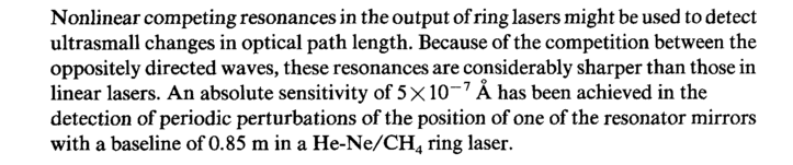 Nonlinear competing resonances in the output of ring lasers might be used to detect ultrasmall changes in optical path length. Because of the competition between the oppositely directed waves, these resonances are considerably sharper than those in linear lasers. An absolute sensitivity of5XlO~7A has been achieved in the detection of periodic perturbations of the position of one of the resonator mirrors with a baseline of 0.85 m in a He-Ne/CH4 ring laser.
