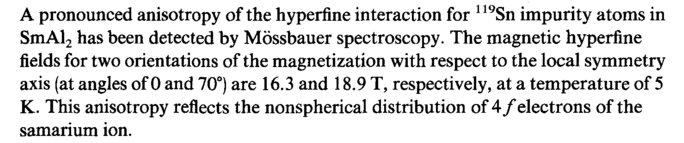 A pronounced anisotropy of the hyperfine interaction for 119Sn impurity atoms in SmAl2 has been detected by Mossbauer spectroscopy. The magnetic hyperfine fields for two orientations of the magnetization with respect to the local symmetry axis (at angles of 0 and 70°) are 16.3 and 18.9 T, respectively, at a temperature of 5 K. This anisotropy reflects the nonspherical distribution of Af electrons of the samarium ion.