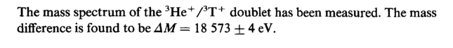 The mass spectrum of the 3He+/3T+ doublet has been measured. The mass difference is found to be AM = 18 573 ± 4 eV.