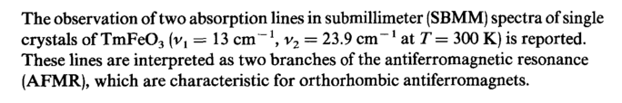 The observation of two absorption lines in submillimeter (SBMM) spectra of single crystals of TmFe03 (vl = 13 cm~ \ v2 = 23.9 cm'1 at Τ = 300 К) is reported. These lines are interpreted as two branches of the antiferromagnetic resonance (AFMR), which are characteristic for orthorhombic antiferromagnets.
