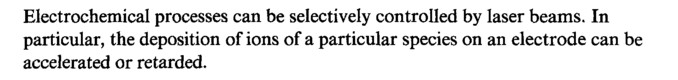 Electrochemical processes can be selectively controlled by laser beams. In particular, the deposition of ions of a particular species on an electrode can be accelerated or retarded.