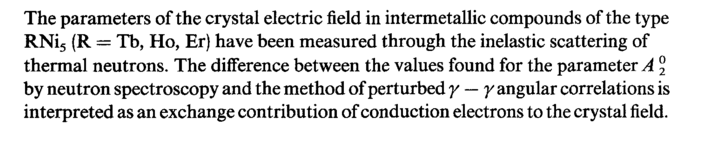 The parameters of the crystal electric field in intermetallic compounds of the type RNi5 (R = Tb, Ho, Er) have been measured through the inelastic scattering of thermal neutrons. The difference between the values found for the parameter A ° by neutron spectroscopy and the method of perturbed γ — γ angular correlations is interpreted as an exchange contribution of conduction electrons to the crystal field.