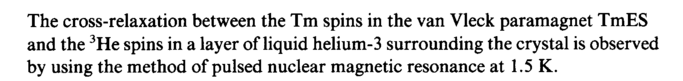 The cross-relaxation between the Tm spins in the van Vleck paramagnet TmES and the 3He spins in a layer of liquid helium-3 surrounding the crystal is observed by using the method of pulsed nuclear magnetic resonance at 1.5 K.