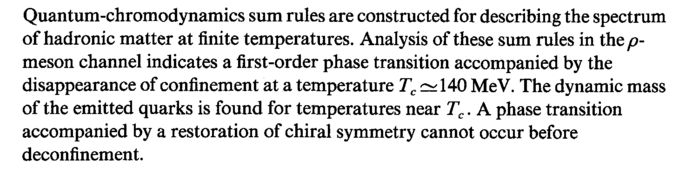 Quantum-chromodynamics sum rules are constructed for describing the spectrum of hadronic matter at finite temperatures. Analysis of these sum rules in the p-meson channel indicates a first-order phase transition accompanied by the disappearance of confinement at a temperature Tc с^140 MeV. The dynamic mass of the emitted quarks is found for temperatures near Tc. A phase transition accompanied by a restoration of chiral symmetry cannot occur before deconfinement.