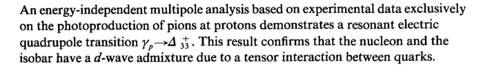 An energy-independent multipole analysis based on experimental data exclusively on the photoproduction of pions at protons demonstrates a resonant electric quadrupole transition Υρ-^Δ 3^. This result confirms that the nucleon and the isobar have a cZ-wave admixture due to a tensor interaction between quarks.