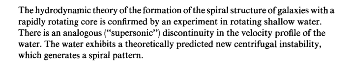 The hydrodynamic theory of the formation of the spiral structure of galaxies with a rapidly rotating core is confirmed by an experiment in rotating shallow water. There is an analogous ("supersonic") discontinuity in the velocity profile of the water. The water exhibits a theoretically predicted new centrifugal instability, which generates a spiral pattern.