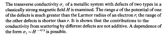 The transverse conductivity aL of a metallic system with defects of two types in a classically strong magnetic field Η is examined, the range a of the potential of one of the defects is much greater than the Larmor radius of an electron r; the range of the other defects is shorter than r. It is shown that the contributions to the conductivity from scattering by different defects are not additive. A dependence of the form aL ~H _4/3 is possible.