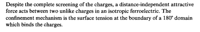 Despite the complete screening of the charges, a distance-independent attractive force acts between two unlike charges in an isotropic ferroelectric. The confinement mechanism is the surface tension at the boundary of a 180° domain which binds the charges.