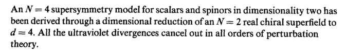 An N = 4 supersymmetry model for scalars and spinors in dimensionality two has been derived through a dimensional reduction of an N = 2 real chiral superfield to d = 4, All the ultraviolet divergences cancel out in all orders of perturbation theory.