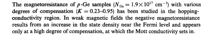 The magnetoresistance of p-Ge samples (NGa = 1.9X 1017 cm"3) with various degrees of compensation {K = 0.23-0.95) has been studied in the hopping-conduetivity region. In weak magnetic fields the negative magnetoresistance results from an increase in the state density near the Fermi level and appears only at a high degree of compensation, at which the Mott conductivity sets in.