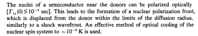 The nuclei of a semiconductor near the donors can be polarized optically [Tle(0)S 10~4 sec]. This leads to the formation of a nuclear polarization front, which is displaced from the donor within the limits of the diffusion radius, similarly to a shock wavefront. An effective method of optical cooling of the nuclear spin system to ~10~6 К is used.