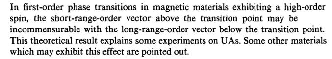 In first-order phase transitions in magnetic materials exhibiting a high-order spin, the short-range-order vector above the transition point may be incommensurable with the long-range-order vector below the transition point. This theoretical result explains some experiments on UAs. Some other materials which may exhibit this effect are pointed out.