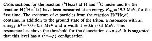 Cross sections for the reaction (6He,a) at Η and 12C nuclei and for the reaction H(6He,6Li) have been measured at an energy EeHe= 19.3 MeV, for the first time. The spectrum of a particles from the reaction H(6He,a) contains, in addition to the ground state of the triton, a resonance with an energy £* = 7.0±0.3 MeV and a width Γ=0.6±0.3 MeV. This resonance lies above the threshold for the dissociation t->n+d. It is suggested that this level has a (2n+p) configuration.
