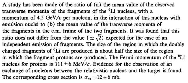 A study has been made of the ratio of (a) the mean value of the observed transverse momenta of the fragments of the 6Li nucleus, with a momentum of 4.5 GeV/c per nucleon, in the interaction of this nucleus with emulsion nuclei to (b) the mean value of the transverse momenta of the fragments in the cm. frame of the two fragments. It was found that this ratio does not differ from the value fe) expected for the case of an independent emission of fragments. The size of the region in which the doubly charged fragments of 6Li are produced is about half the size of the region in which the fragment protons are produced. The Fermi momentum of the 6Li nucleus for protons is 111 ± 6 MeV/c. Evidence for the observation of an exchange of nucleons between the relativistic nucleus and the target is found. The corresponding cross section is стех= 12 ±6 mb.