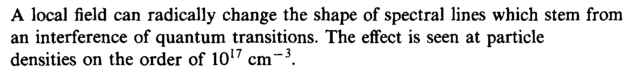A local field can radically change the shape of spectral lines which stem from an interference of quantum transitions. The effect is seen at particle densities on the order of 1017 cm-3.