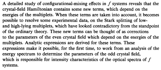 A detailed study of configurational-mixing effects in / systems reveals that the crystal-field Hamiltonian contains some new terms, which depend on the energies of the multiplets. When these terms are taken into account, it becomes possible to resolve some experimental data, on the Stark splitting of low-and high-lying multiplets, which have looked contradictory from the standpoint of the ordinary theory. These new terms can be thought of as corrections to the parameters of the even crystal field which depend on the energies of the multiplets. Analytic expressions are derived for these terms. These expressions make it possible, for the first time, to work from an analysis of the energy spectrum to determine the parameters of the odd crystal field, which is responsible for intensity characteristics of the optical spectra of / systems.