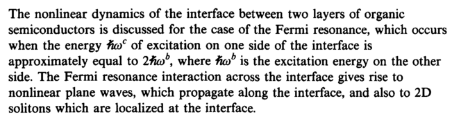 The nonlinear dynamics of the interface between two layers of organic semiconductors is discussed for the case of the Fermi resonance, which occurs when the energy fiaf of excitation on one side of the interface is approximately equal to 2Λω4, where fkob is the excitation energy on the other side. The Fermi resonance interaction across the interface gives rise to nonlinear plane waves, which propagate along the interface, and also to 2D solitons which are localized at the interface.