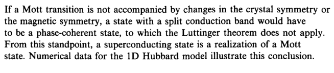 If a Mott transition is not accompanied by changes in the crystal symmetry or the magnetic symmetry, a state with a split conduction band would have to be a phase-coherent state, to which the Luttinger theorem does not apply. From this standpoint, a superconducting state is a realization of a Mott state. Numerical data for the ID Hubbard model illustrate this conclusion.