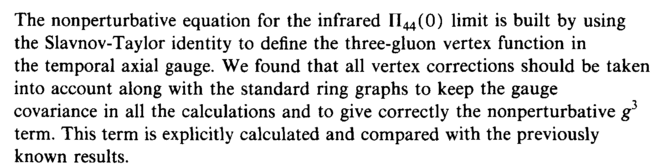 The nonperturbative equation for the infrared 1144(0) limit is built by using the Slavnov-Taylor identity to define the three-gluon vertex function in the temporal axial gauge. We found that all vertex corrections should be taken into account along with the standard ring graphs to keep the gauge covariance in all the calculations and to give correctly the nonperturbative g3 term. This term is explicitly calculated and compared with the previously known results.