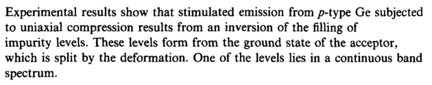 Experimental results show that stimulated emission from /Муре Ge subjected to uniaxial compression results from an inversion of the filling of impurity levels. These levels form from the ground state of the acceptor, which is split by the deformation. One of the levels lies in a continuous band spectrum.