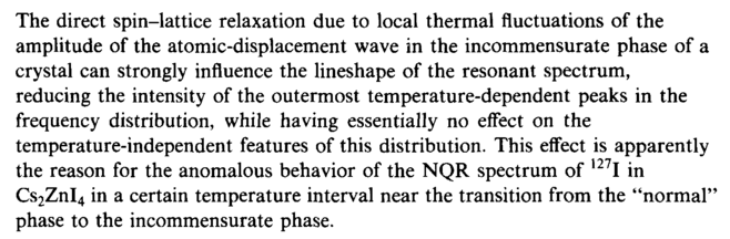 The direct spin-lattice relaxation due to local thermal fluctuations of the amplitude of the atomic-displacement wave in the incommensurate phase of a crystal can strongly influence the lineshape of the resonant spectrum, reducing the intensity of the outermost temperature-dependent peaks in the frequency distribution, while having essentially no effect on the temperature-independent features of this distribution. This effect is apparently the reason for the anomalous behavior of the NQR spectrum of 127I in Cs2ZnI4 in a certain temperature interval near the transition from the "normal" phase to the incommensurate phase.