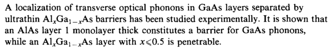 A localization of transverse optical phonons in GaAs layers separated by ultrathin AlxGa]_^As barriers has been studied experimentally. It is shown that an AlAs layer 1 monolayer thick constitutes a barrier for GaAs phonons, while an AlxGat^xAs layer with x<0.5 is penetrable.