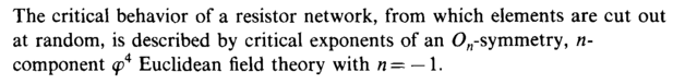 The critical behavior of a resistor network, from which elements are cut out at random, is described by critical exponents of an 0„-symmetry, n-component φ* Euclidean field theory with η = — 1.