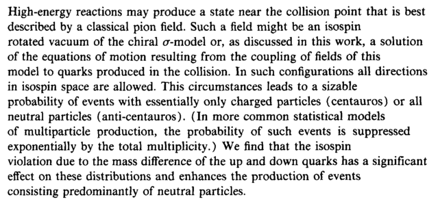 High-energy reactions may produce a state near the collision point that is best described by a classical pion field. Such a field might be an isospin rotated vacuum of the chiral σ-model or, as discussed in this work, a solution of the equations of motion resulting from the coupling of fields of this model to quarks produced in the collision. In such configurations all directions in isospin space are allowed. This circumstances leads to a sizable probability of events with essentially only charged particles (centauros) or all neutral particles (anti-centauros). (In more common statistical models of multiparticle production, the probability of such events is suppressed exponentially by the total multiplicity.) We find that the isospin violation due to the mass difference of the up and down quarks has a significant effect on these distributions and enhances the production of events consisting predominantly of neutral particles.