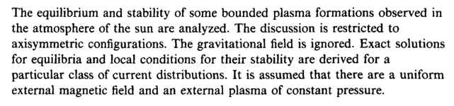 The equilibrium and stability of some bounded plasma formations observed in the atmosphere of the sun are analyzed. The discussion is restricted to axisymmetric configurations. The gravitational field is ignored. Exact solutions for equilibria and local conditions for their stability are derived for a particular class of current distributions. It is assumed that there are a uniform external magnetic field and an external plasma of constant pressure.