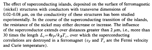 The effect of superconducting islands, deposited on the surface of ferromagnetic (nickel) structures with conductors with transverse dimensions of 0.02-0.08 μιη, on the conductivity of these structures has been studied experimentally. In the course of the superconducting transition of the islands, the resistance of the nickel may either decrease or increase. The influence of the superconductor extends over distances greater than 2 μτη, i.e., more than 30 times the length Lc=fivF/kBTc, over which the superconducting correlations are destroyed in a ferromagnet {vF and Tc are the Fermi velocity and Curie temperature).
