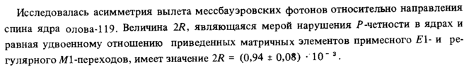 Исследовалась асимметрия вылета мессбауэровских фотонов относительно направления спина ядра олова-119. Величина 2R, являющаяся мерой нарушения Ρ -четности в ядрах и равная удвоенному отношению приведенных матричных элементов примесного Elи регулярного Ml-переходов, имеет значение 2R = (0,94 + 0,08) -10 3