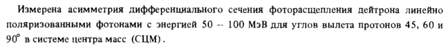 Измерена асимметрия дифференциального сечения фоторасщепления дейтрона линейно поляризованными фотонами с энергией 50 — 100 МэВ для углов вылета протонов 45, 60 и 90° в системе центра масс (СЦМ).