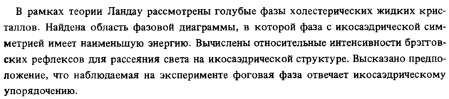 В рамках теории Ландау рассмотрены голубые фазы холестерических жидких кристаллов. Найдена область фазовой диаграммы, в которой фаза с икосаэдрической симметрией имеет наименьшую энергию. Вычислены относительные интенсивности брэггов-ских рефлексов для рассеяния света на икосаэдрической структуре. Высказано предположение, что наблюдаемая на эксперименте фоговая фаза отвечает икосаэдрическому упорядочению.