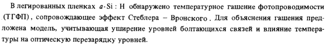 В легированных пленках a-Si: Η обнаружено температурное гашение фотопроводимости (ТГФП), сопровождающее эффект Стеблера Вронского. Для объяснения гашения предложена модель, учитывающая уширение уровней болтающихся связей и влияние температуры на оптическую перезарядку уровней.