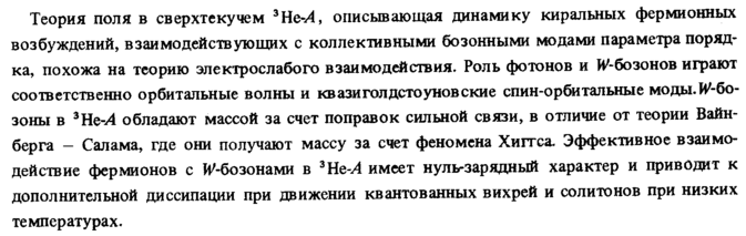 Теория поля в сверхтекучем 3Hev4, описывающая динамику киральных фермионных возбуждений, взаимодействующих с коллективными бозонными модами параметра порядка, похожа на теорию электрослабого взаимодействия. Роль фотонов и W-бозонов играют соответственно орбитальные волны и квази гол дето уновские спин-орбитальные моды.И'-бо-зоны в 3Не-^4 обладают массой за счет поправок сильной связи, в отличие от теории Ваин-берга Салама, где они получают массу за счет феномена Хигтса. Эффективное взаимодействие фермионов с W-бозонами в 3Не-А имеет нуль-зарядный характер и приводит к дополнительной диссипации при движении квантованных вихрей и солитонов при низких температурах.