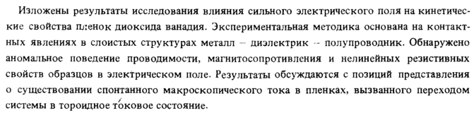 Изложены результаты исследования влияния сильного электрического поля на кинетические свойства пленок диоксида ванадия. Экспериментальная методика основана на контактных явлениях в слоистых структурах металл диэлектрик полупроводник. Обнаружено аномальное поведение проводимости, магнитосопротивления и нелинейных резистивных свойств образцов в электрическом поле. Результаты обсуждаются с позиций представления о существовании спонтанного макроскопического тока в пленках, вызванного переходом системы в тороидное токовое состояние.