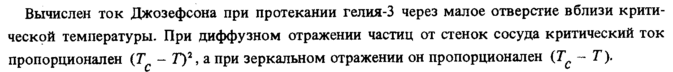 Вычислен ток Джозефсона при протекании гелия-3 через малое отверстие вблизи критической температуры. При диффузном отражении частиц от стенок сосуда критический ток пропорционален (Г Г)2, а при зеркальном отражении он пропорционален (Г, Г).
