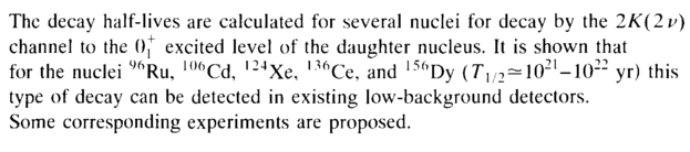 The decay half-lives are calculated for several nuclei for decay by the 2K(2v) channel to the Of excited level of the daughter nucleus. It is shown that for the nuclei 46Ru, 106Cd, l24Xe, l16Ce, and 15(,Dy (Г1/2 = 1021-1022 yr) this type of decay can be detected in existing low-background detectors. Some corresponding experiments are proposed.