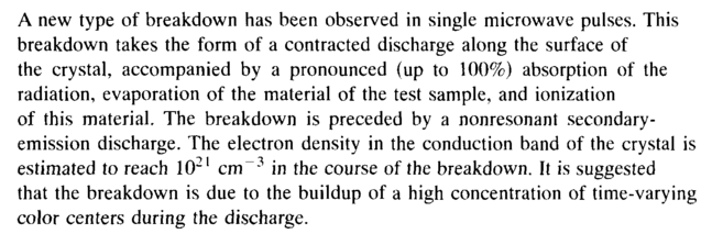 A new type of breakdown has been observed in single microwave pulses. This breakdown takes the form of a contracted discharge along the surface of the crystal, accompanied by a pronounced (up to 100%) absorption of the radiation, evaporation of the material of the test sample, and ionization of this material. The breakdown is preceded by a nonresonant secondary-emission discharge. The electron density in the conduction band of the crystal is estimated to reach 102' cm~3 in the course of the breakdown. It is suggested that the breakdown is due to the buildup of a high concentration of time-varying color centers during the discharge.