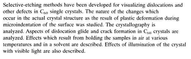 Selective-etching methods have been developed for visualizing dislocations and other defects in C6(l single crystals. The nature of the changes which occur in the actual crystal structure as the result of plastic deformation during microindentation of the surface was studied. The crystallography is analyzed. Aspects of dislocation glide and crack formation in C6(l crystals are analyzed. Effects which result from holding the samples in air at various temperatures and in a solvent are described. Effects of illumination of the crystal with visible light are also described.