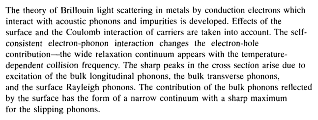 The theory of Brillouin light scattering in metals by conduction electrons which interact with acoustic phonons and impurities is developed. Effects of the surface and the Coulomb interaction of carriers are taken into account. The self-consistent electron-phonon interaction changes the electron-hole contribution—the wide relaxation continuum appears with the temperature-dependent collision frequency. The sharp peaks in the cross section arise due to excitation of the bulk longitudinal phonons, the bulk transverse phonons, and the surface Rayleigh phonons. The contribution of the bulk phonons reflected by the surface has the form of a narrow continuum with a sharp maximum for the slipping phonons.