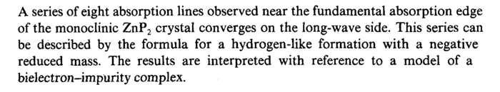 A series of eight absorption lines observed near the fundamental absorption edge of the monoclinic ZnP2 crystal converges on the long-wave side. This series can be described by the formula for a hydrogen-like formation with a negative reduced mass. The results are interpreted with reference to a model of a bielectron-impurity complex.
