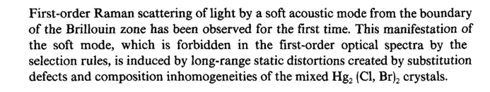 First-order Raman scattering of light by a soft acoustic mode from the boundary of the Brillouin zone has been observed for the first time. This manifestation of the soft mode, which is forbidden in the first-order optical spectra by the selection rules, is induced by long-range static distortions created by substitution defects and composition inhomogeneities of the mixed Hg2 (CI, Br)2 crystals.