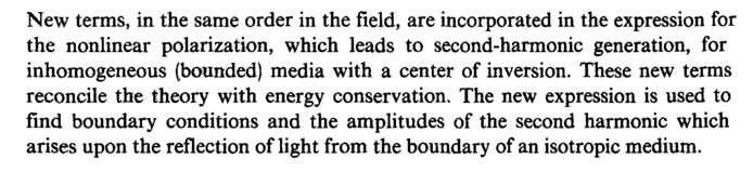 New terms, in the same order in the field, are incorporated in the expression for the nonlinear polarization, which leads to second-harmonic generation, for inhomogeneous (bounded) media with a center of inversion. These new terms reconcile the theory with energy conservation. The new expression is used to find boundary conditions and the amplitudes of the second harmonic which arises upon the reflection of light from the boundary of an isotropic medium.