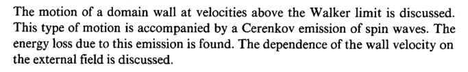 The motion of a domain wall at velocities above the Walker limit is discussed. This type of motion is accompanied by a Cerenkov emission of spin waves. The energy loss due to this emission is found. The dependence of the wall velocity on the external field is discussed.